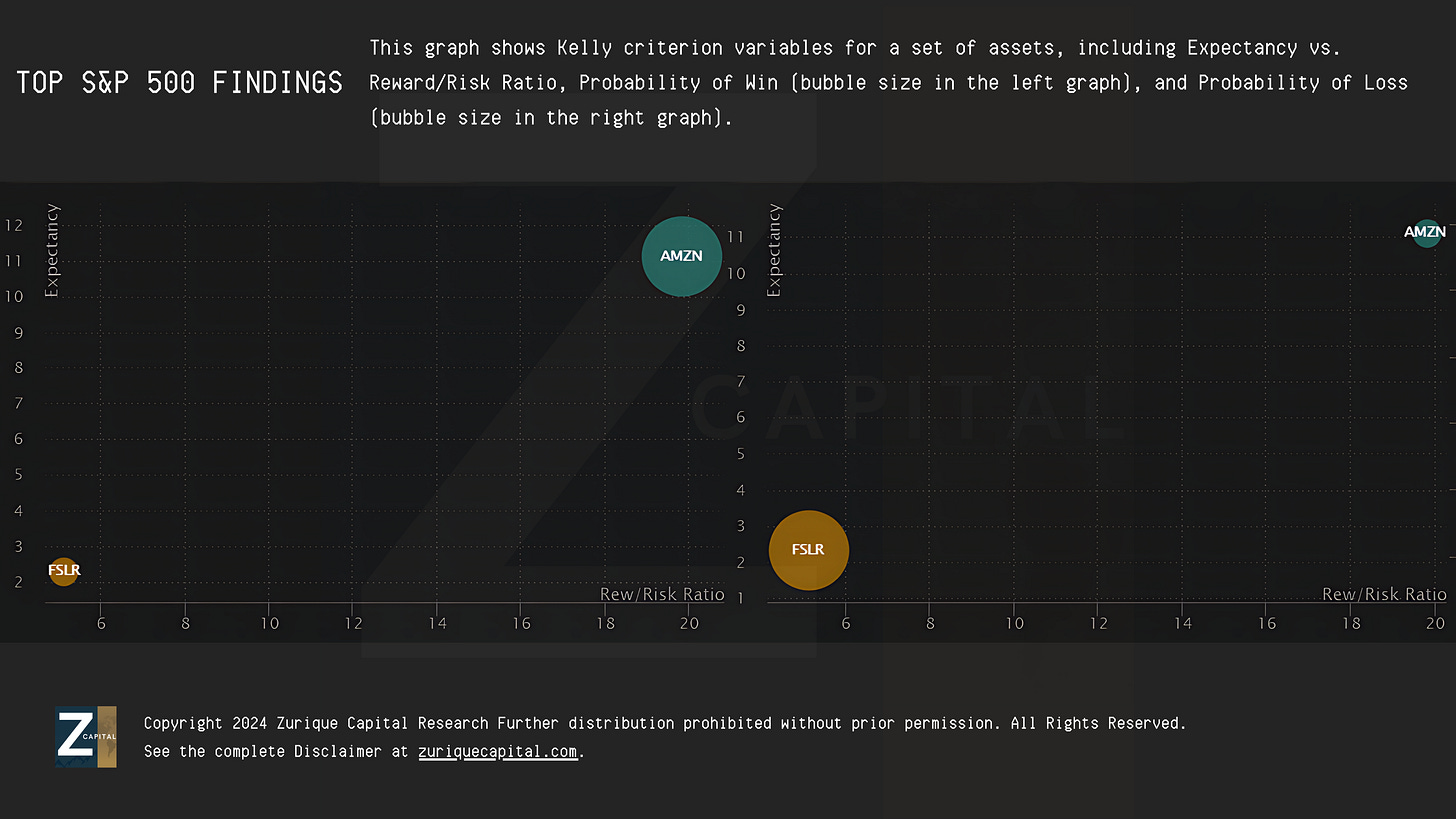 Alpha 3 - Gain Expectancy: FSLR 0.00%↑ has a gain expectancy of 2.30, while AMZN 0.00%↑ has 11.10, indicating the projected future performance of these assets based on empirical data.