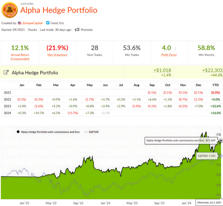 The Alpha Hedge Portfolio demonstrated a strong daily performance with a gain of 1.4%, contributing to a monthly performance increase of 2.5%.