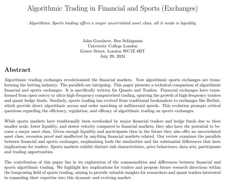 The paper compares algorithmic trading in financial markets and sports exchanges, emphasizing their similarities and differences.