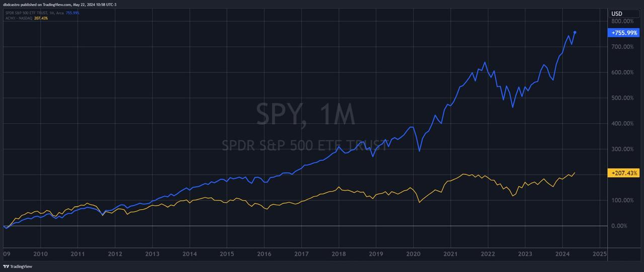 A $50k investment in SPY 0.00%↑ from May/2008* has grown to 273.3k, compared to only $81.5k if invested in ACWX 0.00%↑ .