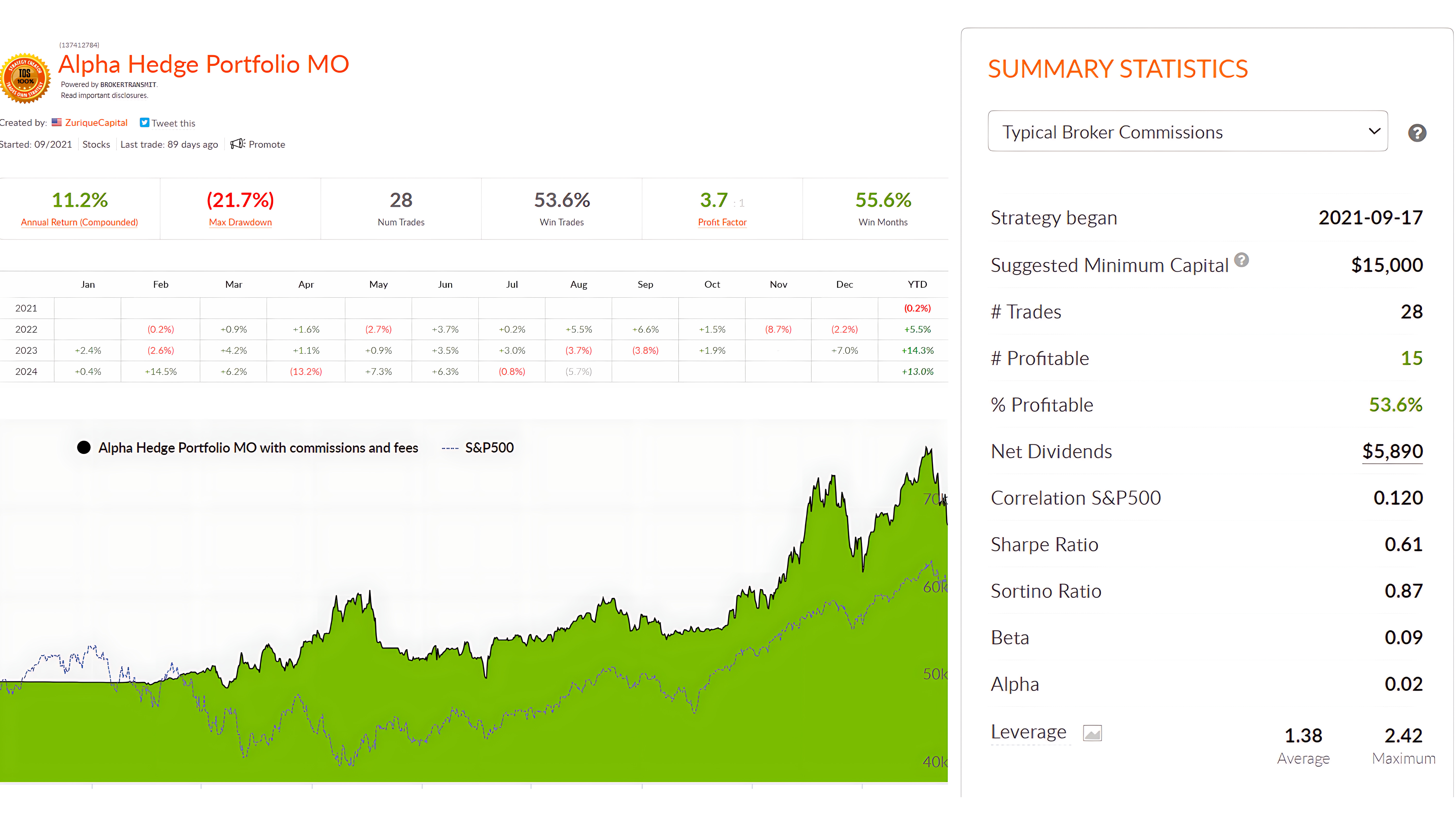 Annual Return (Compounded): The Alpha Hedge Portfolio has achieved a remarkable 11.2% compounded annual return since its inception on September 17, 2021.