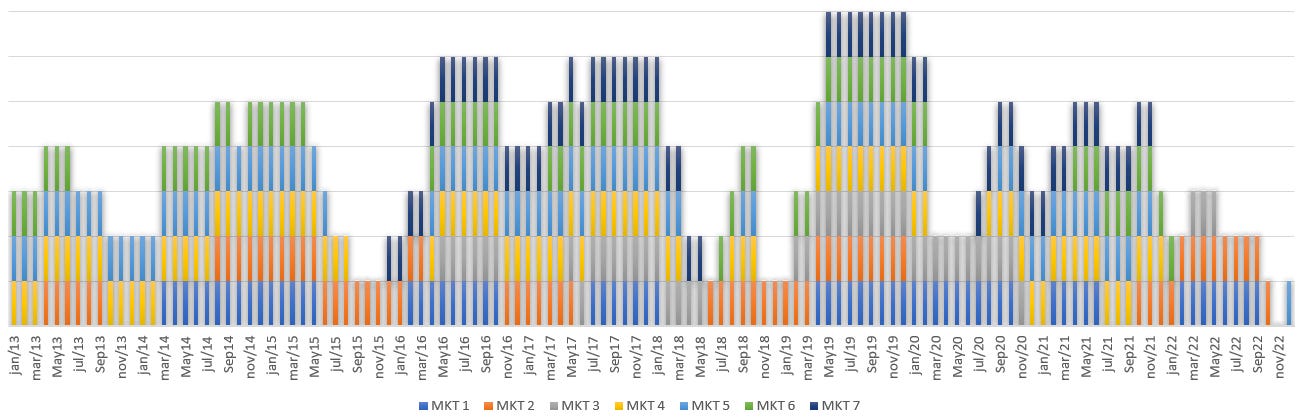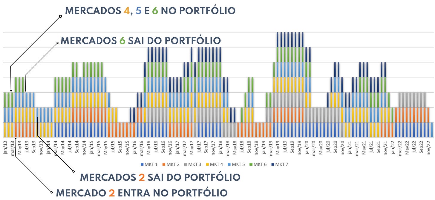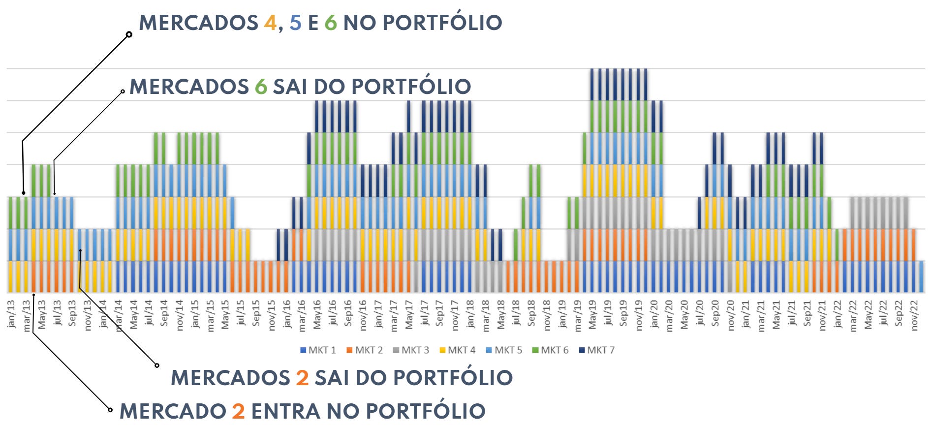 Observe o gráfico abaixo. Ele mostra o período em que cada um dos mercados esteve em Ciclo Positivo de Mercado e presente no Portfólio Alfa Wall Street de 2013 a 2022.