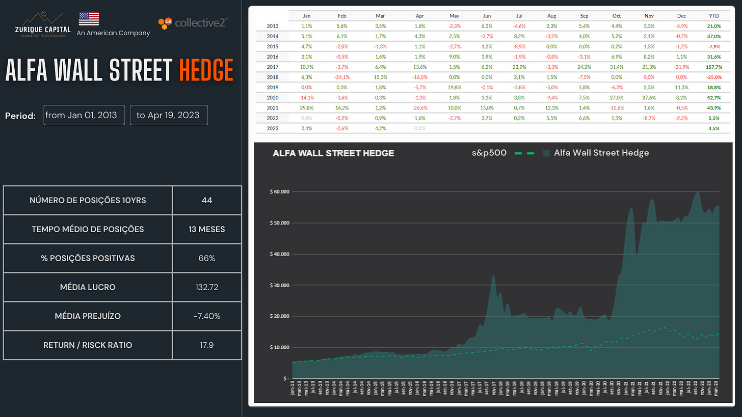 De janeiro/13 a abril/23, temos os seguintes dados históricos do Portfólio Alfa Wall Street Hedge: