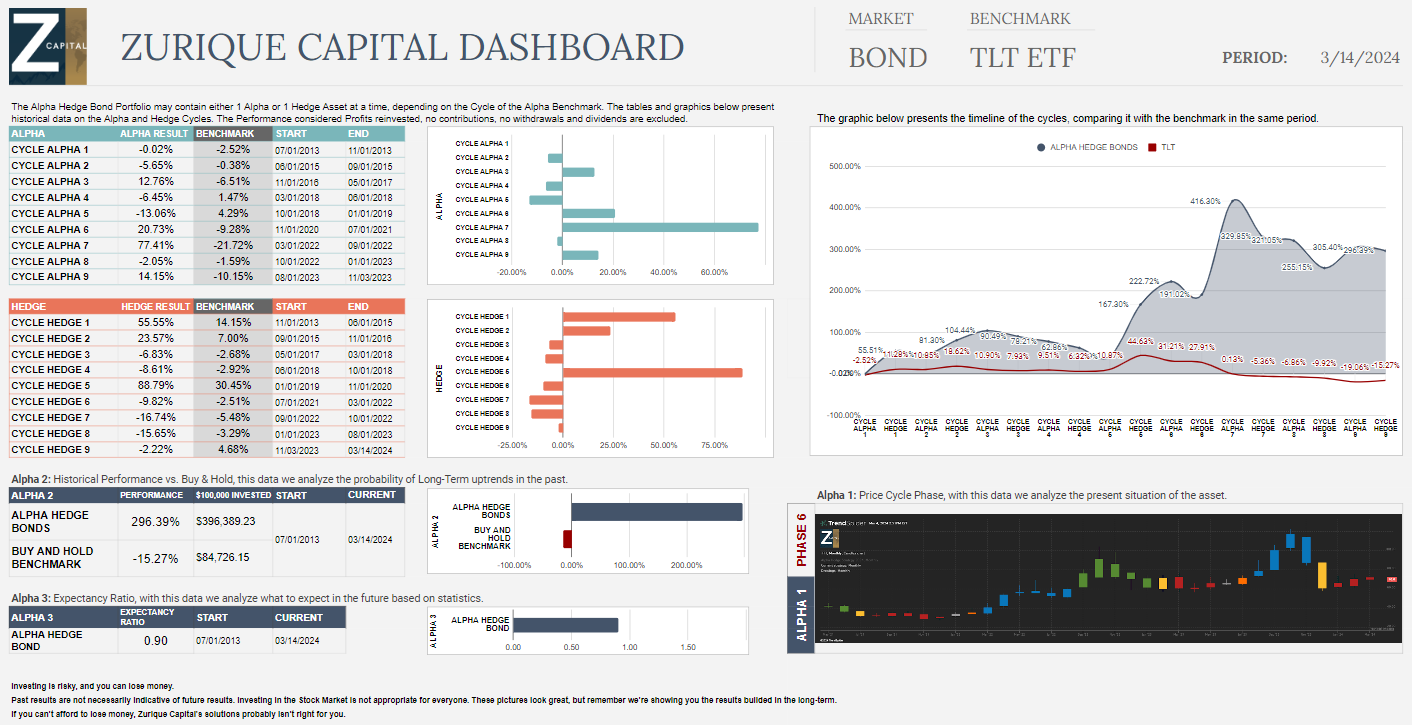 The Bond Market's driving force is the 20-Year Rate, currently in Phase 6 (Denial Phase). A Hedge Position was established in November 2023. As of March 14, 2024, this Hedge Cycle experienced a negative return of -2.22%, the Alpha Hedge Bond Portfolio has yielded 296.39% since July 2013*.