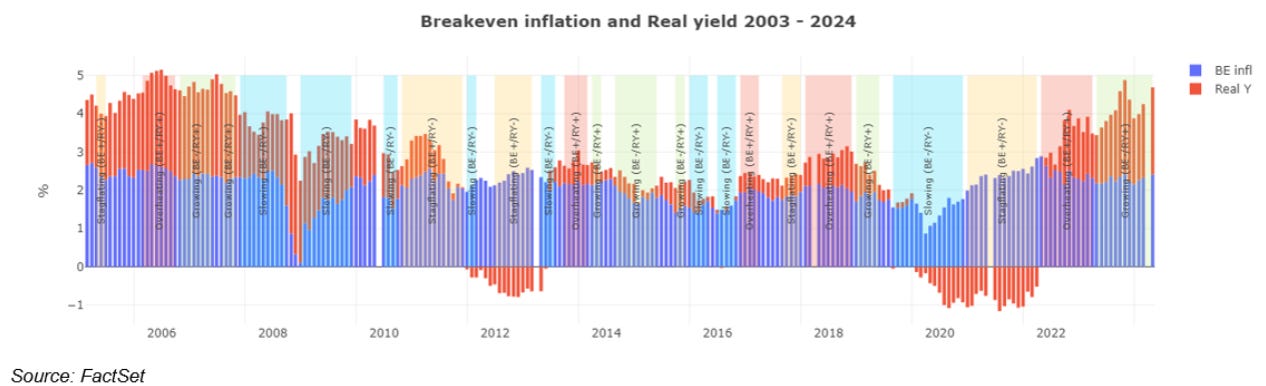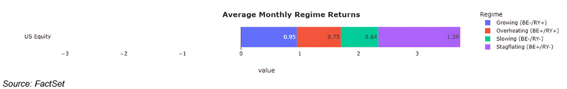 The regimes include Growing (BE+/RY+), Overheating (BE+/RY+), Slowing (BE-/RY+), and Stagflation (BE-/RY-).