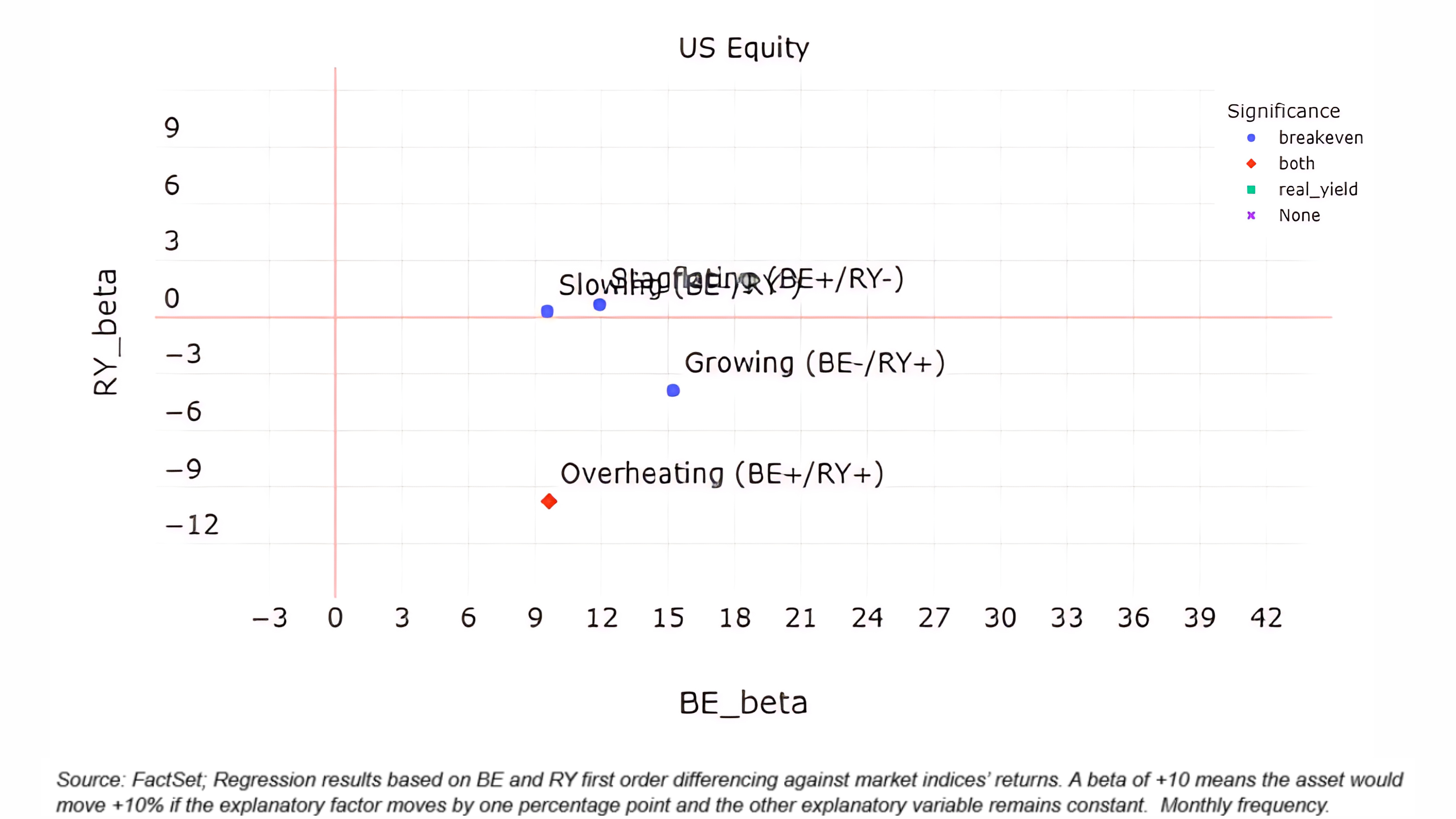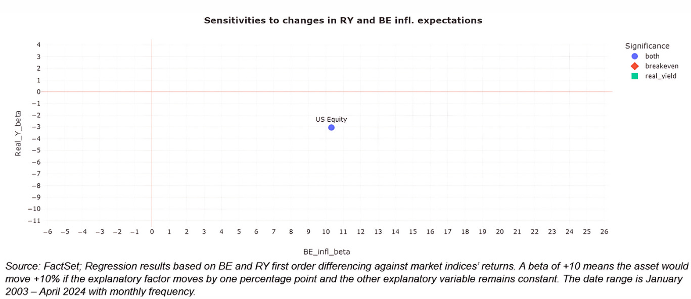 The positive correlation with BE indicates that inflation expectations significantly influence performance, while the negative correlation with RY suggests that higher real yields can dampen equity returns.