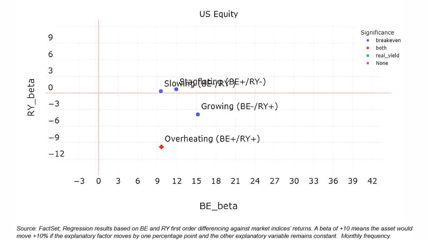The sensitivity plot illustrates how the S&P 500 respond to different economic regimes categorized by breakeven inflation (BE) and real yields (RY).