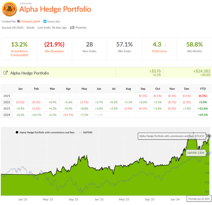 The Alpha Hedge Portfolio experienced a gain today, reflecting the overall performance of the S&P 500, which rose by +0.2%.