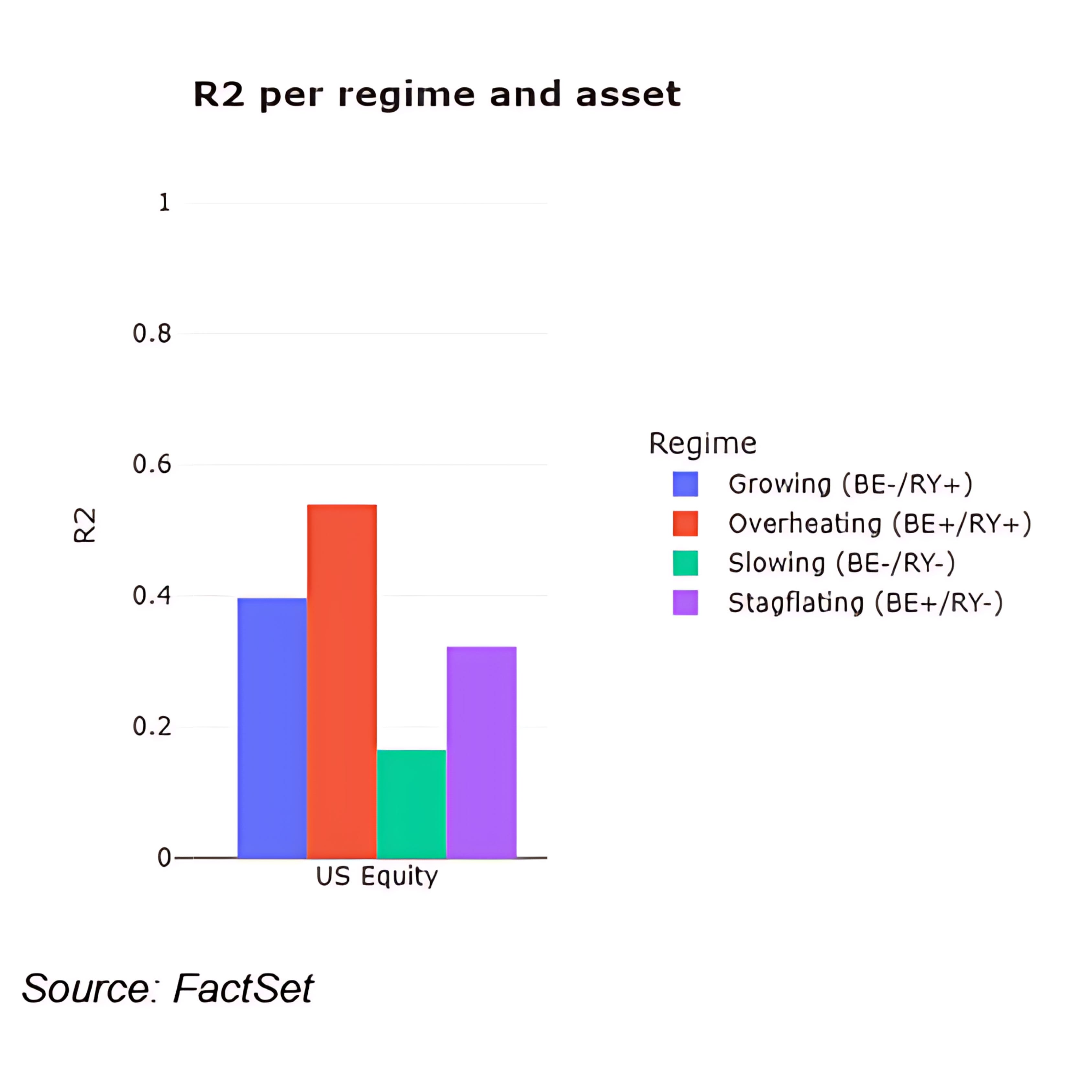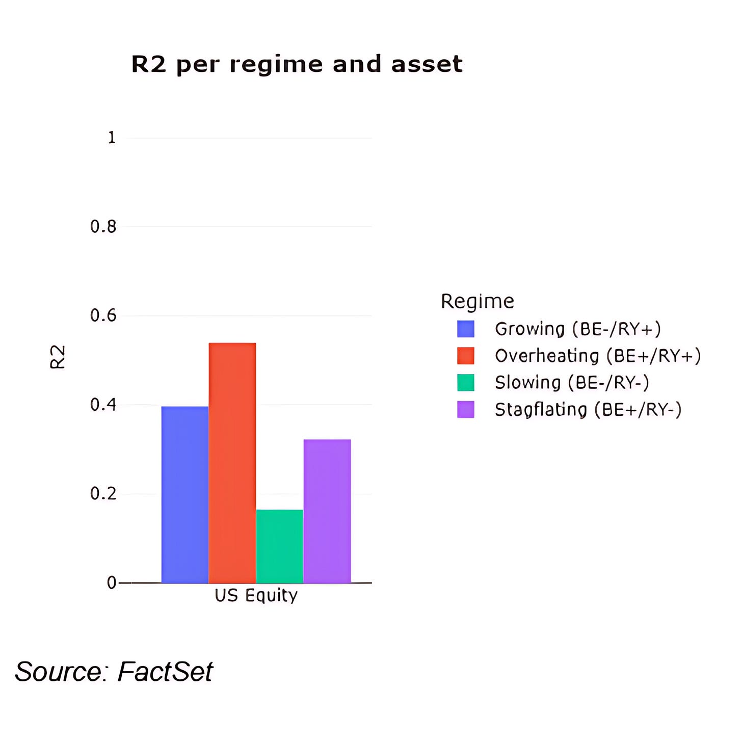 The S&P 500 is positively affected by changes in inflation expectations, with the overheating regime being the most significant where both variables markedly impact the asset class.