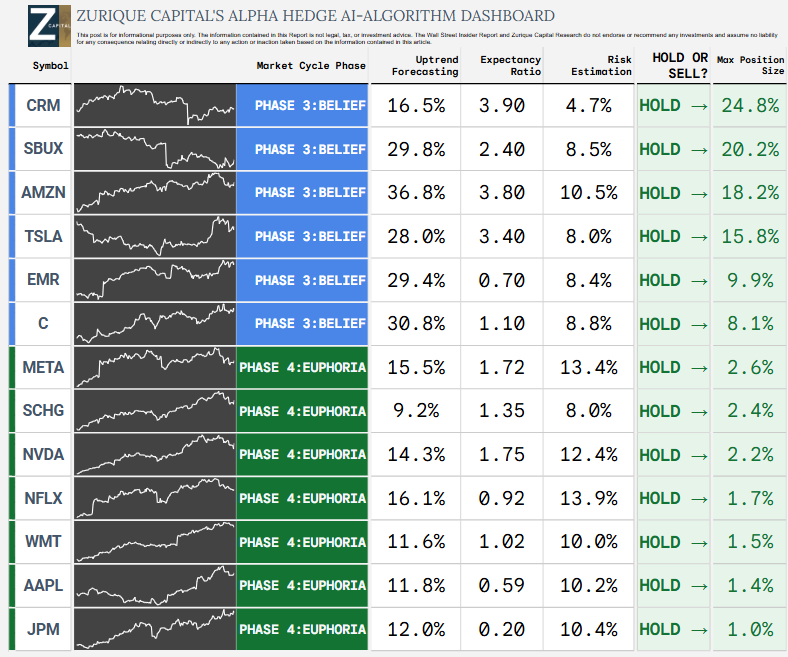 Our analysis reveals that most of these assets are in phases 3 or 4, and we provide recommendations for maximum portfolio allocations for each, highlighting Salesforce CRM, Starbucks, Amazon, Tesla, and EMR as the best assets for investment at the moment.