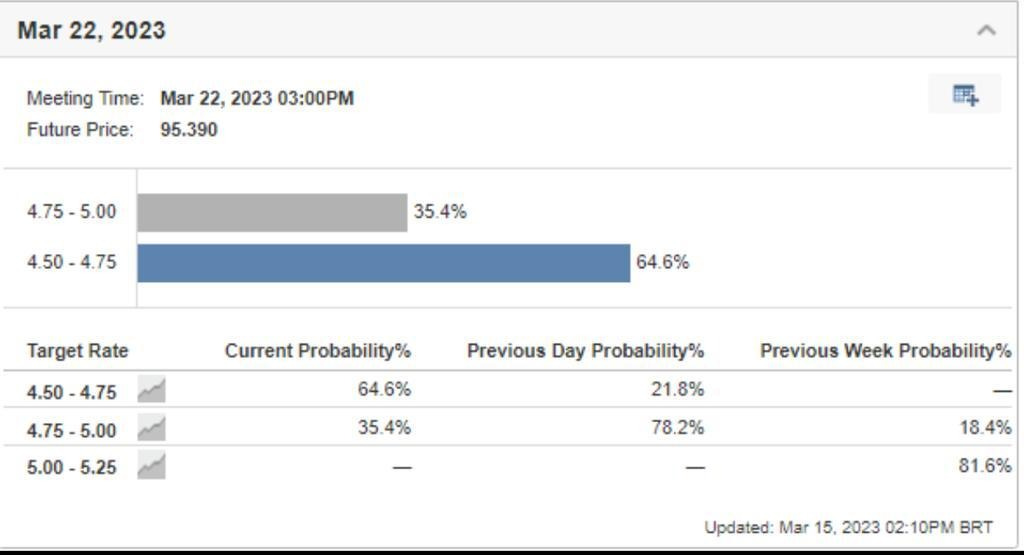 Considerando o atual cenário do sistema financeiro, agora as apostas são de manutenção de taxa de juros pelo Fed na reunião do FOMC da próxima semana (64%).