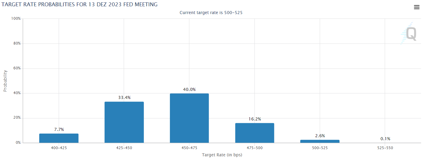 Segundo a ferramenta FedWatch do CME Group, os mercados dão praticamente 2.6% de chance de que os juros permaneçam no nível atual de 5-5,25bps até o final do ano.