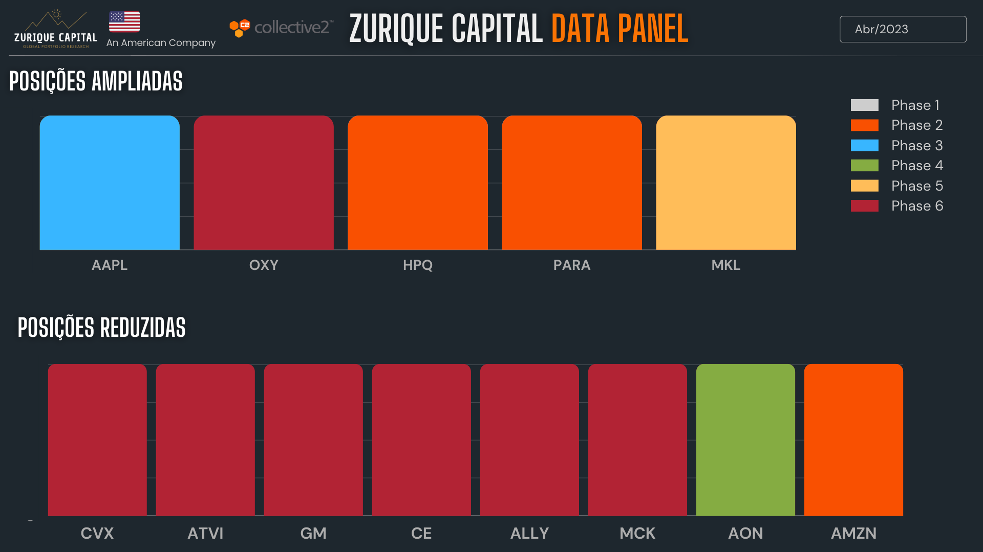 Analisamos o Relatório 13F de Warren Buffett identificamos suas maiores movimentações. Além disso identificamos a Fase do Ciclo de Mercado de cada um desses Ativos, conforme legenda no gráfico.
