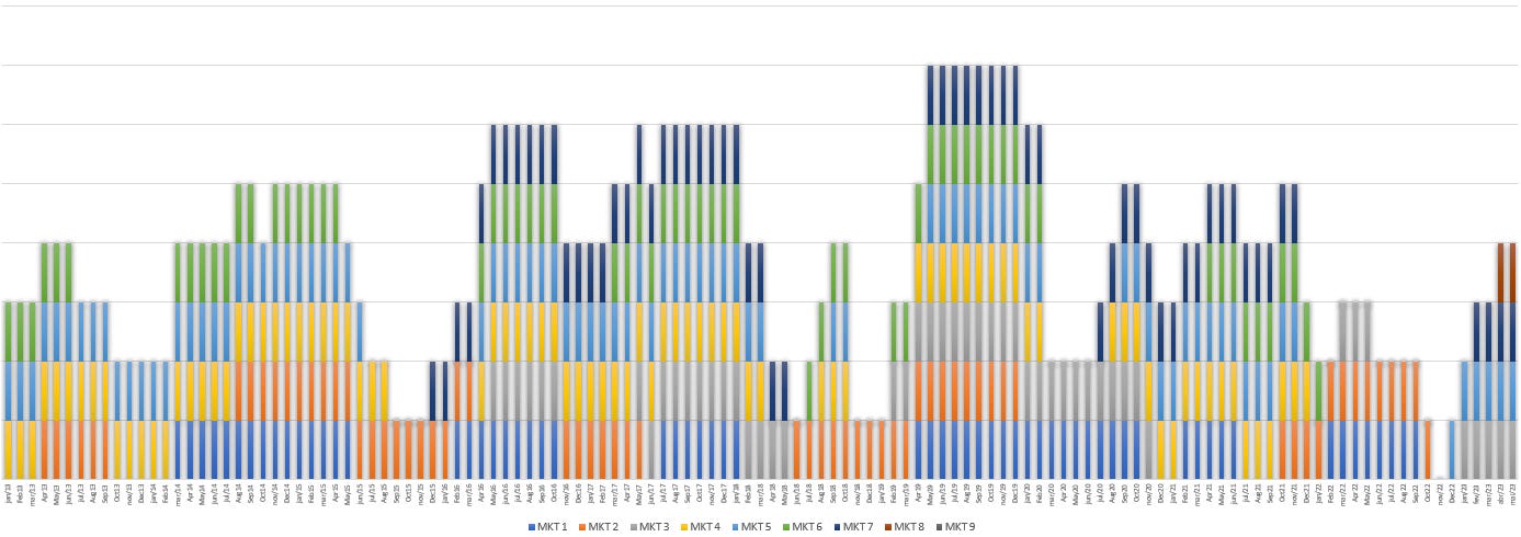 O gráfico acima mostra o período em que cada um dos mercados esteve em Ciclo Positivo de Mercado e presente no Portfólio Alfa Wall Street de 2013 a 2023.