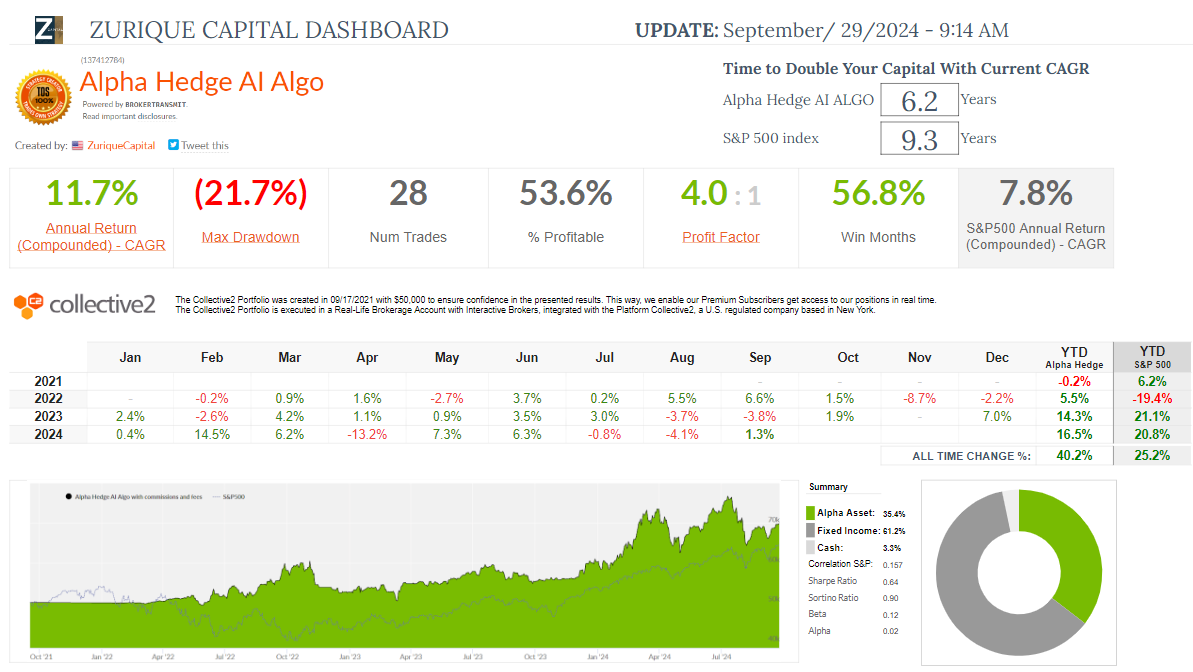 The Collective2 Portfolio was established on September 17, 2021, with an initial investment of $50,000 to ensure confidence in the presented results. This Platform allows our Premium Subscribers to access the Alpha Hedge Portfolio in real-time and join us on our journey to increase our portfolio tenfold within a decade.
