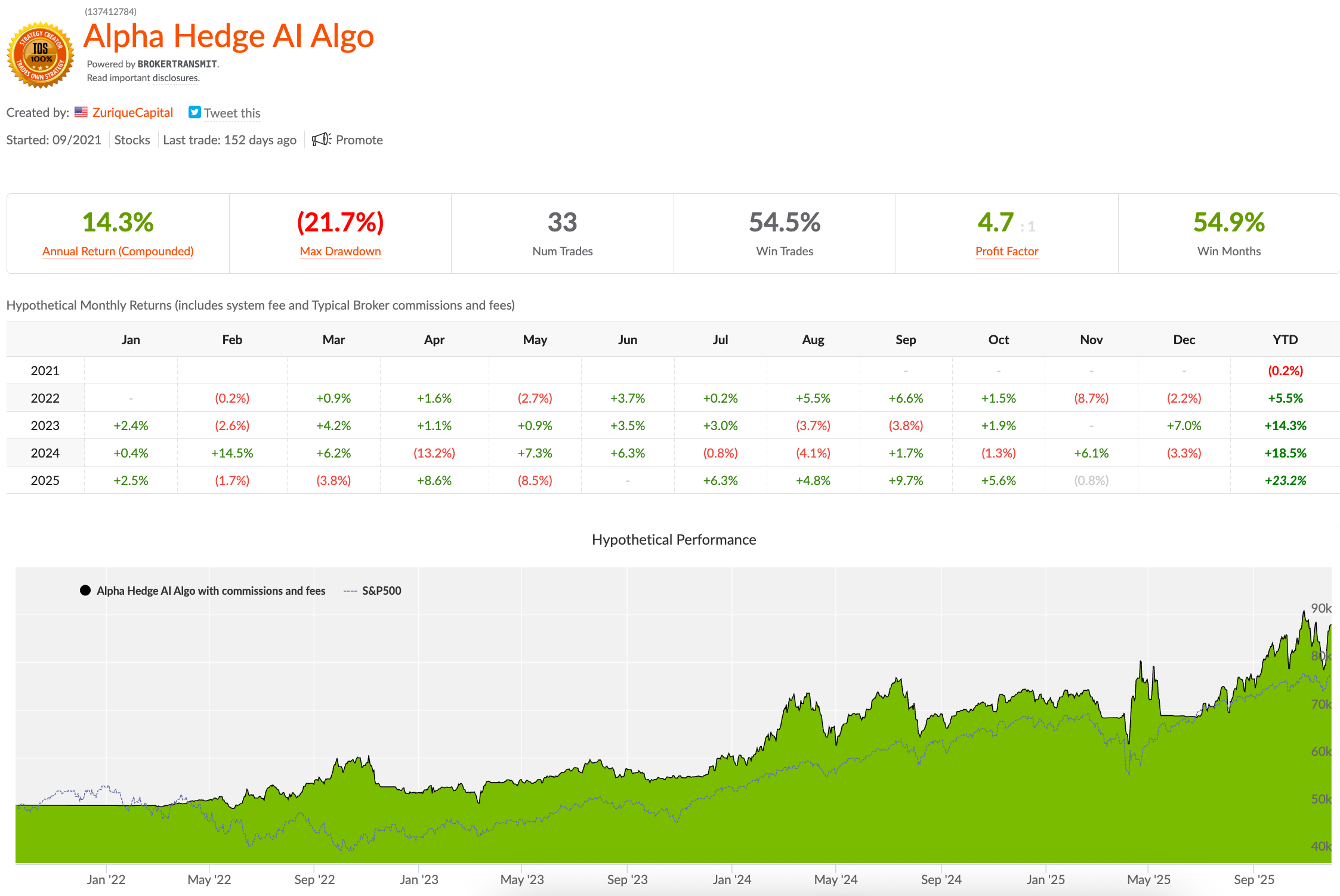 The Alpha Hedge AI Algo Portfolio closed November down 0.8%, after four consecutive positive months, and now stands at +23.2% year-to-date, versus the S&P 500’s 16.45%. The S&P 500 remained in Phase 2 of the cycle throughout November.