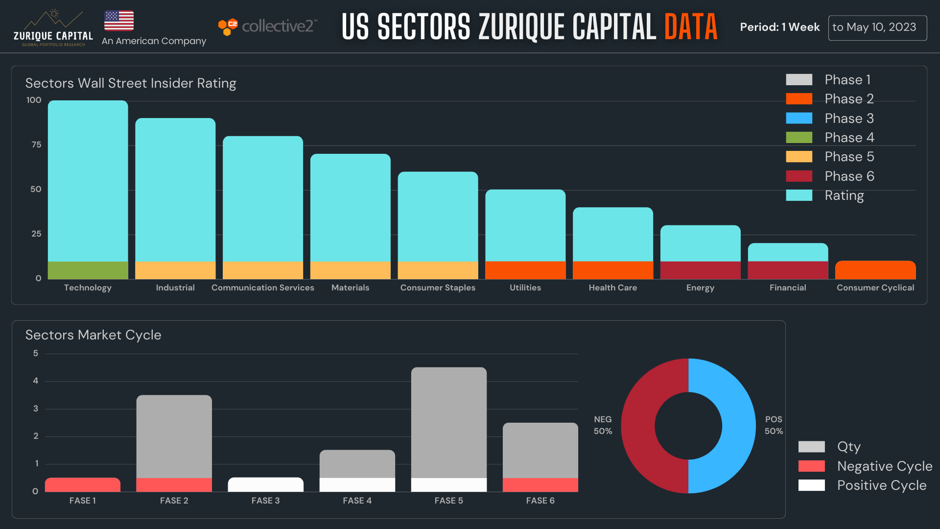 Na atualização da semana 17 tínhamos 60% dos setores americanos em Ciclo Negativo. Agora empatou 50/50% com a evolução do setor de Serviços de Comunicação.
