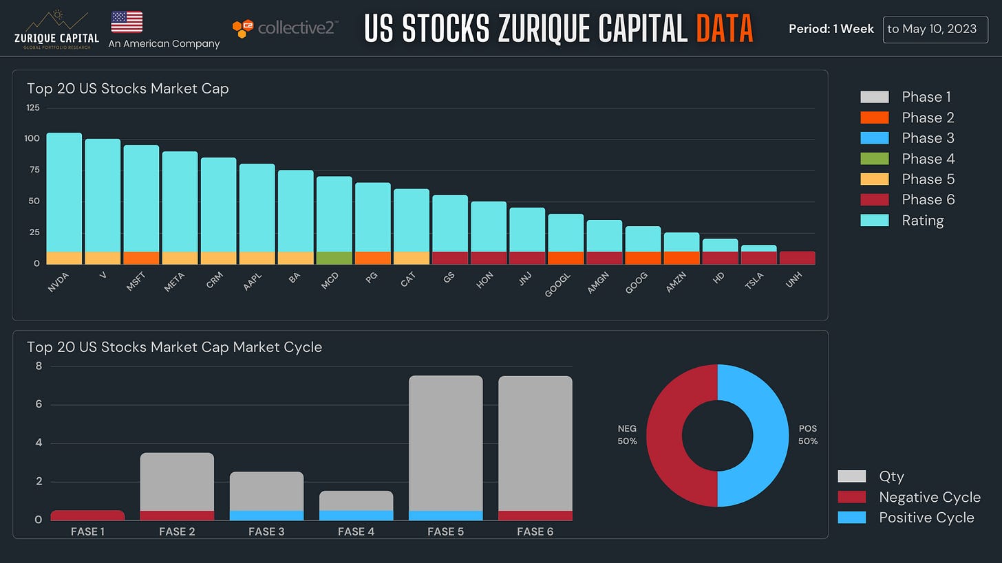 As empresas de maior capitalização encontram-se, assim como os Setores Americanos no meio a meio, metade em Ciclo Positivo e metade em Ciclo negativo.