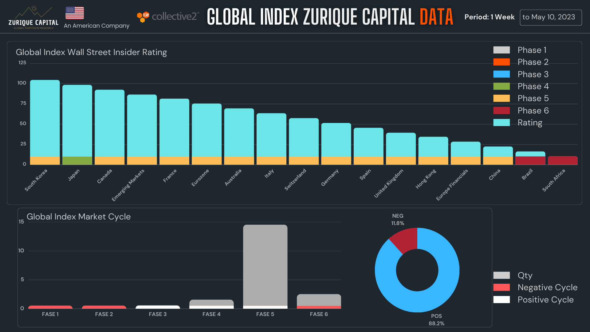 Mas 88% dos índices globais monitorados encontram-se em Ciclo Positivo, apenas Brasil e África do Sul em Ciclo Negativo.