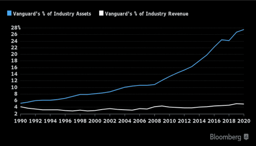 Revenue Growth: Despite the significant increase in assets, Vanguard's revenue share has not grown as dramatically. This can be attributed to Vanguard's low-cost fee structure, which, while attracting a large volume of assets, generates less revenue per dollar of assets compared to traditional mutual funds with higher fees.
