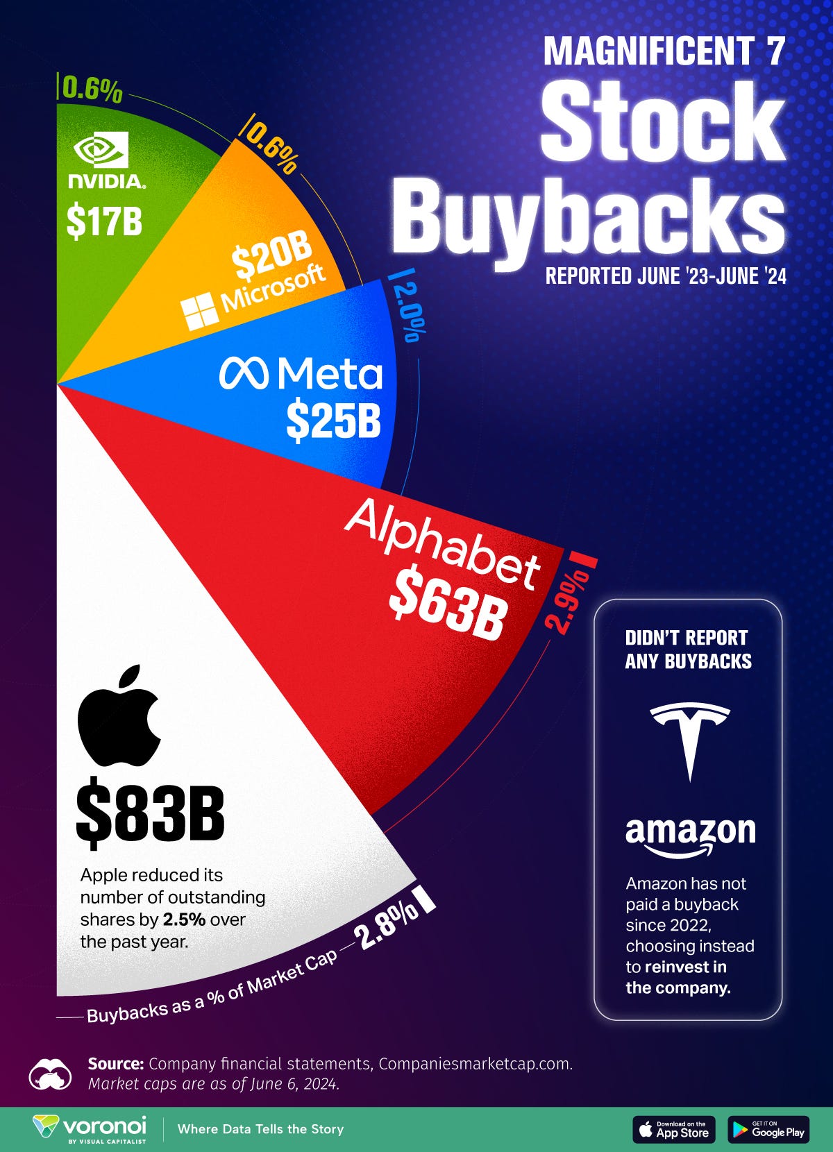 Apple AAPL 0.00%↑ leads the charge with a staggering $83 billion in buybacks, significantly raising its earnings per share. This approach reflects confidence in their stock's value and future prospects.