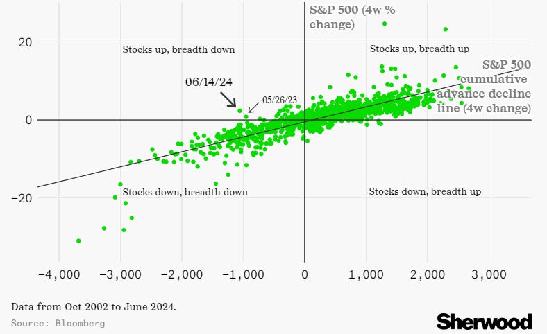 The divergence between mega-caps like Nvidia NVDA 0.00%↑ and the rest of the market is striking. This low breadth is highlighted by the S&P 500's rise despite a significant decline in its cumulative advance-decline line.