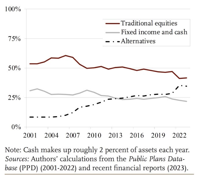 Pension plans have shifted away from traditional equities and bonds to alternatives, aiming for higher returns. However, the increased complexity and active management have not significantly outperformed simple index investing.