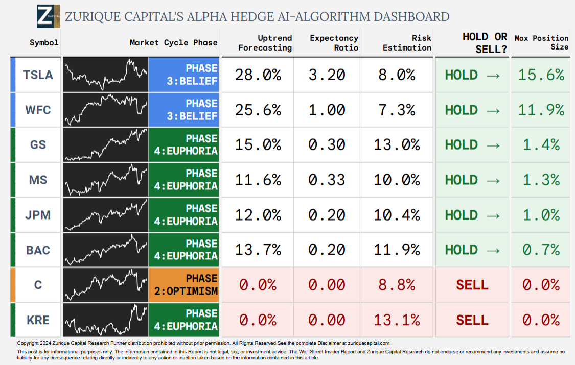 However, amidst the excitement, caution is advised. Advanced AI algorithms, like the Alpha Hedge Algorithm, are signaling caution, with no position recommended for regional banks despite the robust rally.