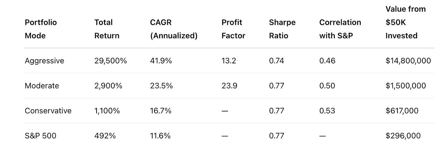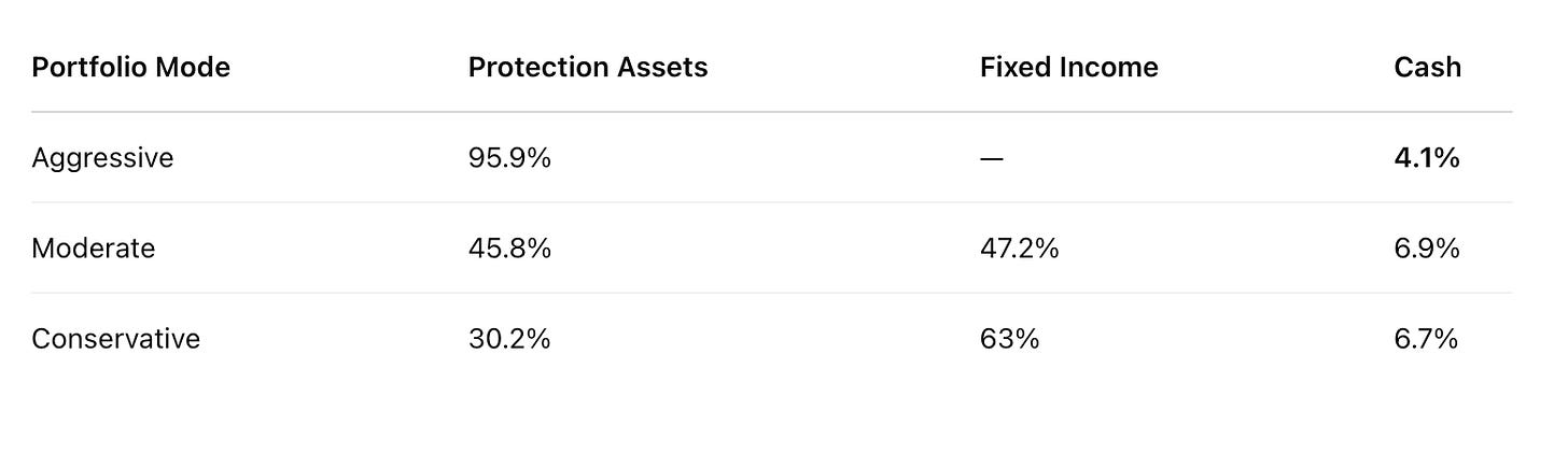 The aggressive mode stands out for its exponential growth over the years, while the moderate and conservative modes offer greater capital preservation and lower correlation with the benchmark, providing protection during periods of market stress.