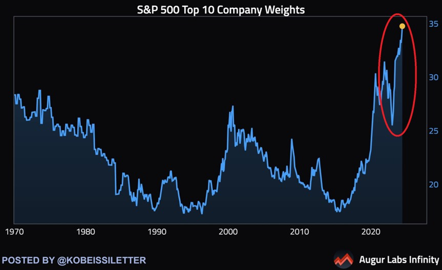 The top 10 companies now make up 35% of the S&P 500 SPY 0.00%↑, surpassing the 2000 Dot-com bubble peak. This highlights a growing dependency on big tech, with Nvidia $NVDA alone contributing 39% of the market cap gain year to date.