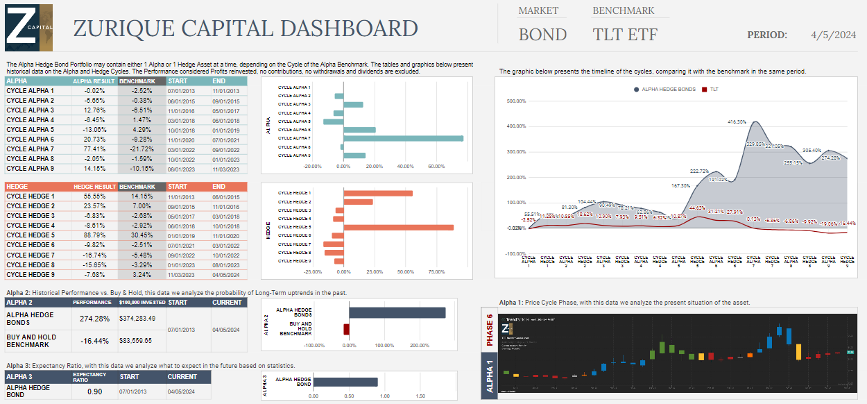 The Bond Market's driving force is the 20-Year Rate, currently in Phase 6 (Denial Phase). A Hedge Position was established in November 2023. As of April 5, 2024, this Hedge Cycle experienced a return of -7.68%, the Alpha Hedge Bond Portfolio has yielded +274.28% since July 2013.