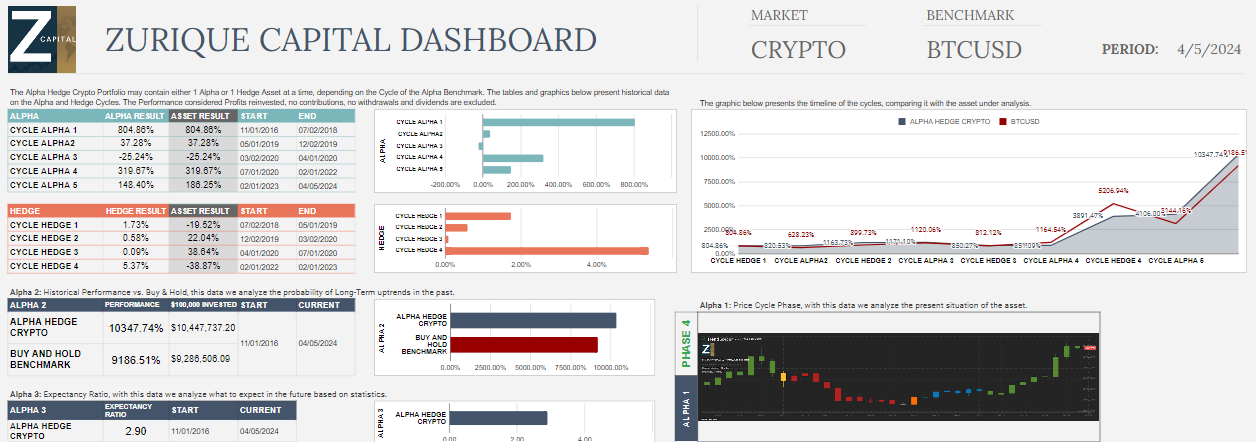 Crypto Market is in Phase 4 (Euphoria Phase). Accordingly, an Alpha position was assembled in February/23. In this Alpha Cycle, up until April 5, 2024, it yielded a return of +148.40%, and +10,347.74%% since November 2016.