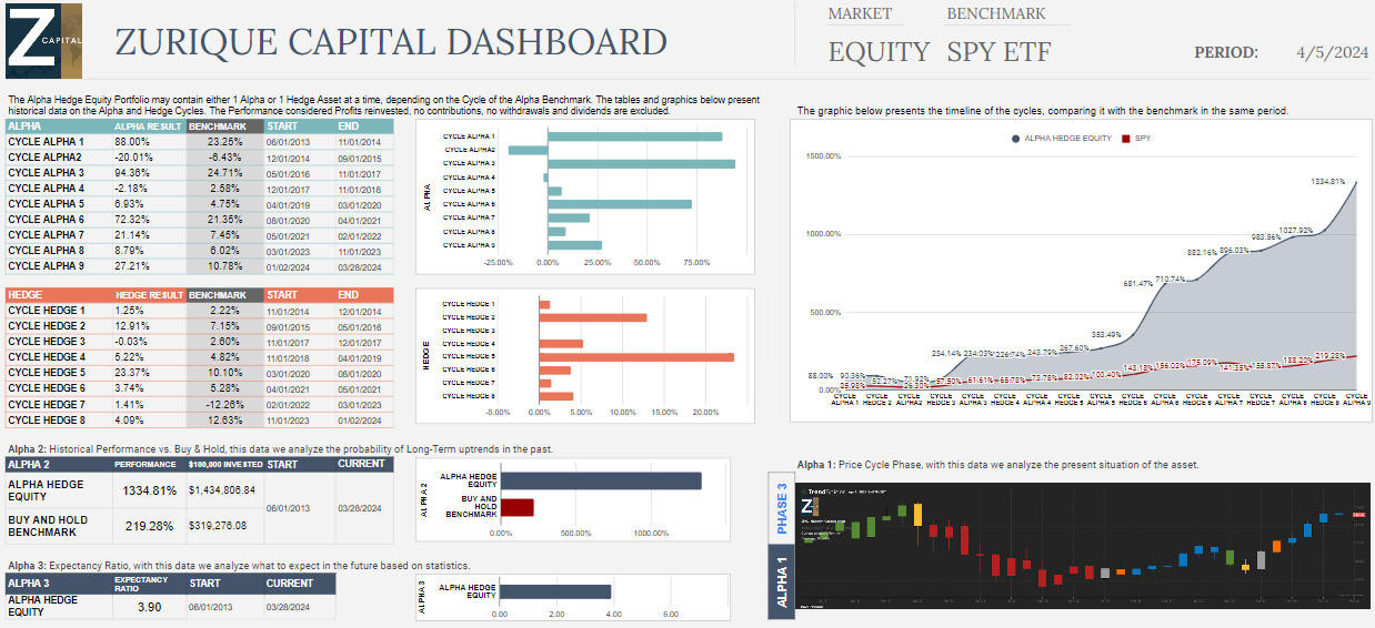 The Equity Market is in Phase 3 (Belief Phase). Accordingly, an Alpha position was assembled in January/24. In this Alpha Cycle, up until April 5, 2024, it yielded a return of +27.21%, and +1334.81% since June 2013.