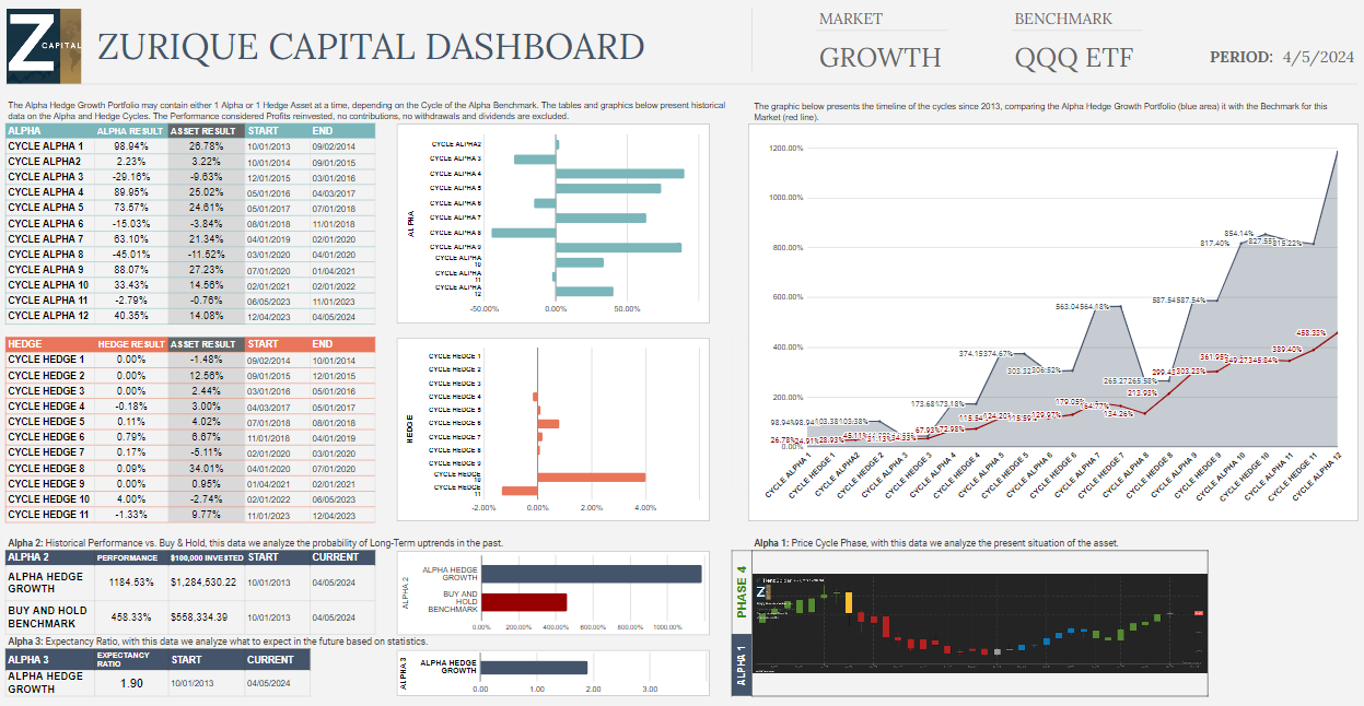 Growth Market is in Phase 4 (Euphoria Phase). Accordingly, an Alpha position was assembled in December/23. In this Alpha Cycle, up until April 5, 2024, it yielded a return of +40.35%, and +1,184.53% since October 2013.